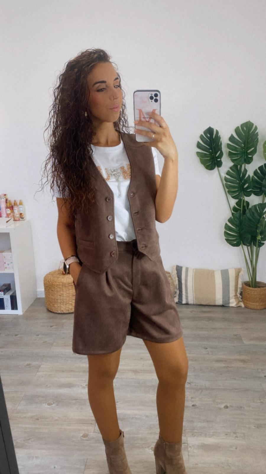 CONJUNTO DE ANTELINA COLOR MARRÓN CHOCOLATE COMPUESTO POR CHALECO Y PANTALÓN CORTO.